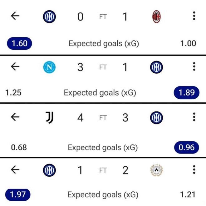 国米在本赛季已经结束的17场比赛中已经输掉了5场,但在这5场失利的比赛中,国米大部分时候在场面上都不落下风,甚至预期进球无一例外都高于对手!这说明什么?说明齐沃的技战术安排是成功的,球队利用主教练制定的阵容和战术打法创造出了比对手多的得分良机,但最终却没能打进,这就是球员把握机会的能力不足!